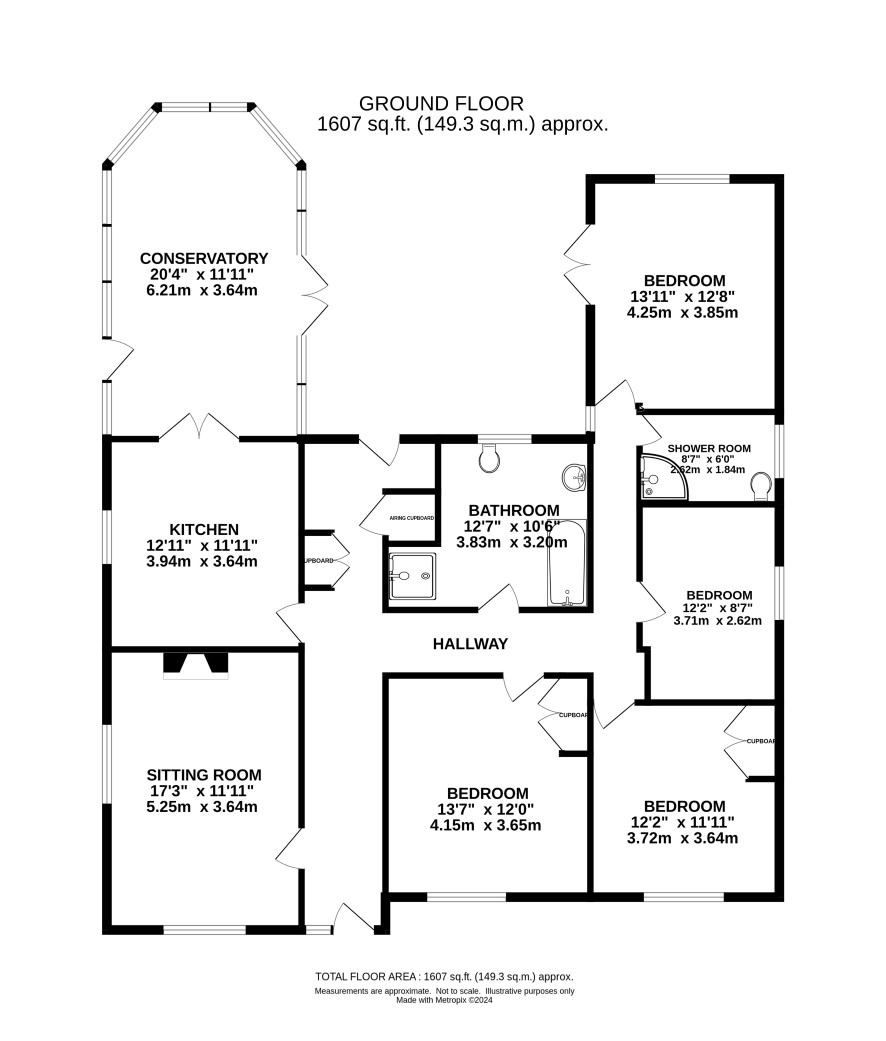 L-shaped entrance hall, sitting room, kitchen, conservatory, utility room, bath/shower room, four double bedrooms and separate shower room.
