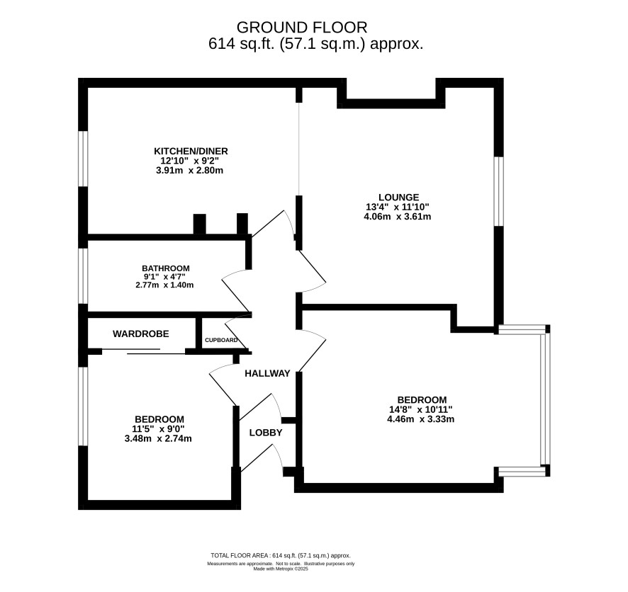 Personal entrance door, entrance hall, lounge, kitchen, bedroom 1, bedroom 2, bathroom/WC
