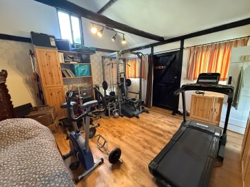 The propery is set back from the road with driveway parking and decorative shrubbery. The rear garden is well stocked and mainly laid to lawn. Detached converted barn, currently used as a home gym and a detached workshop with double doors that open onto the front driveway.