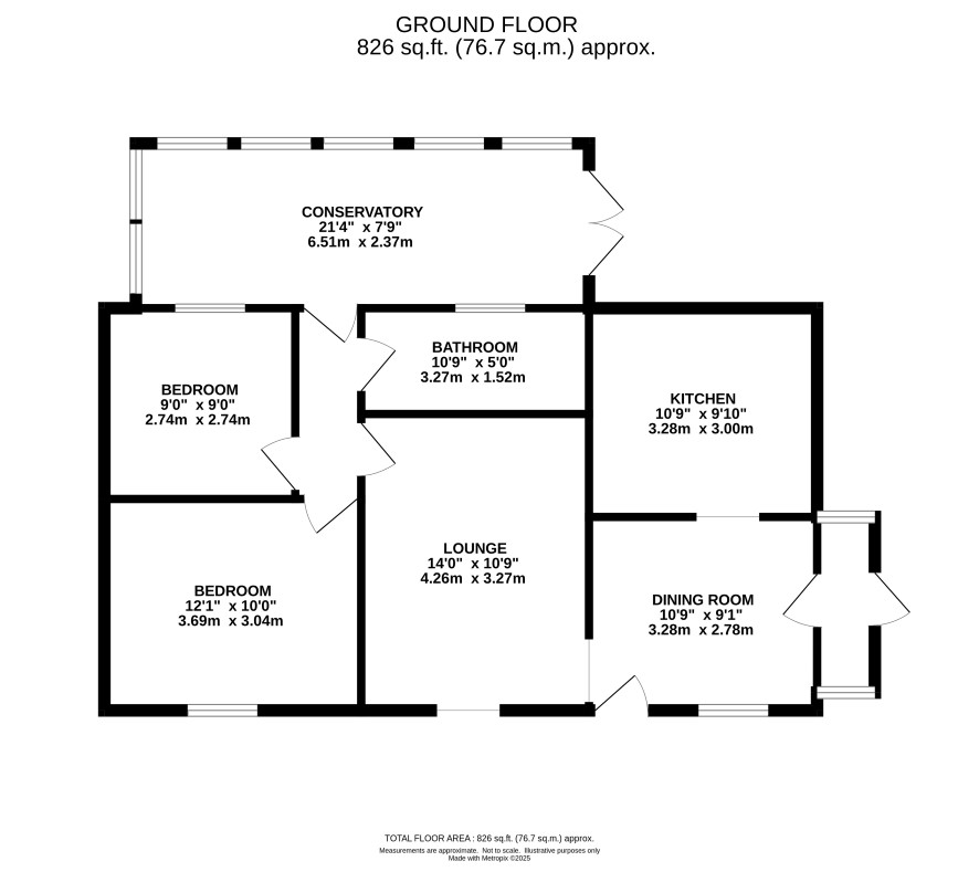 Lounge, dining room, kitchen, two bedrooms, bathroom, conservatory