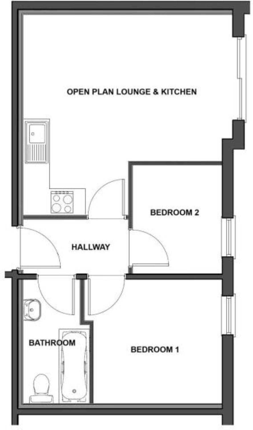 Open plan living room/ kitchen, two bedrooms, bathroom