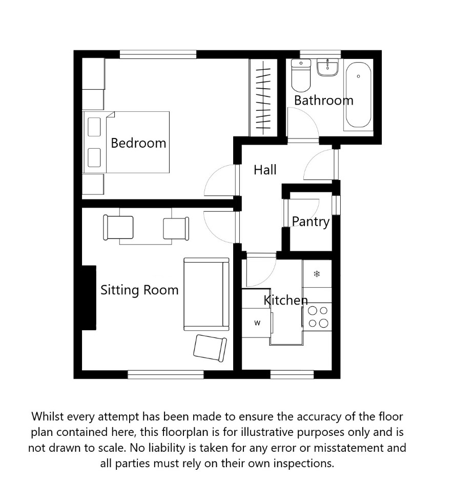 Secure communal entrance, entrance hall, bathroom, sitting room, bedroom, kitchen, pantry