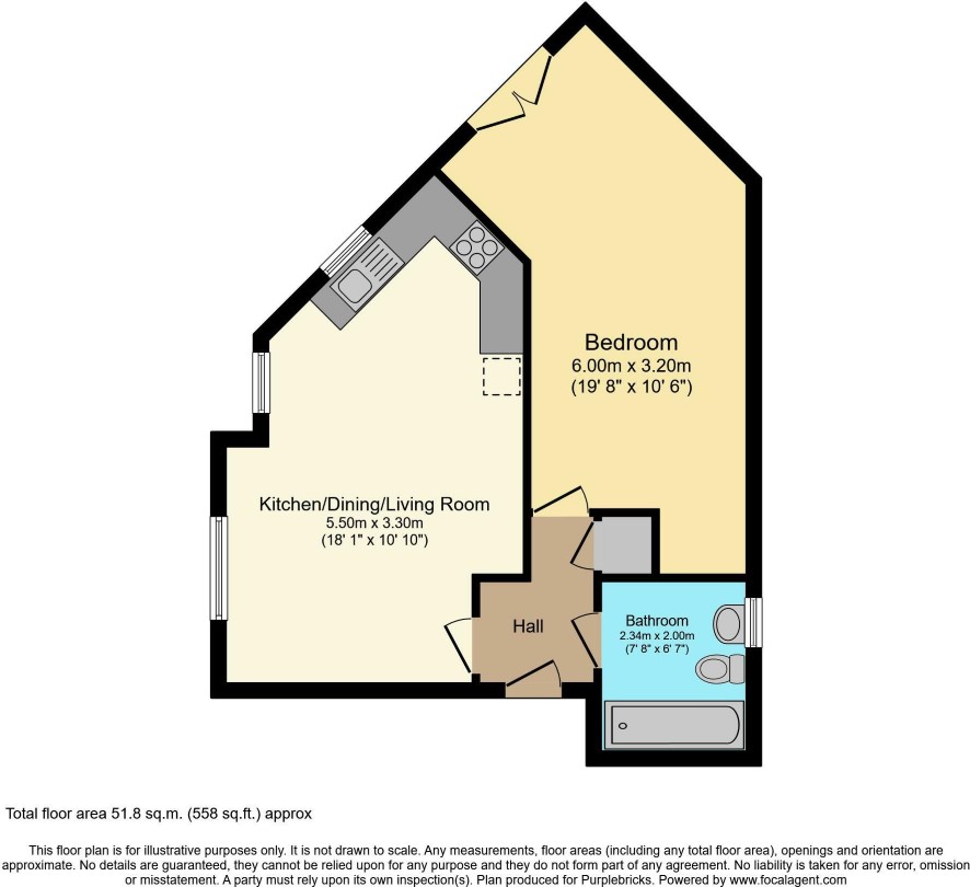 Entrance hall, open plan kitchen/living area, bedroom and bathroom