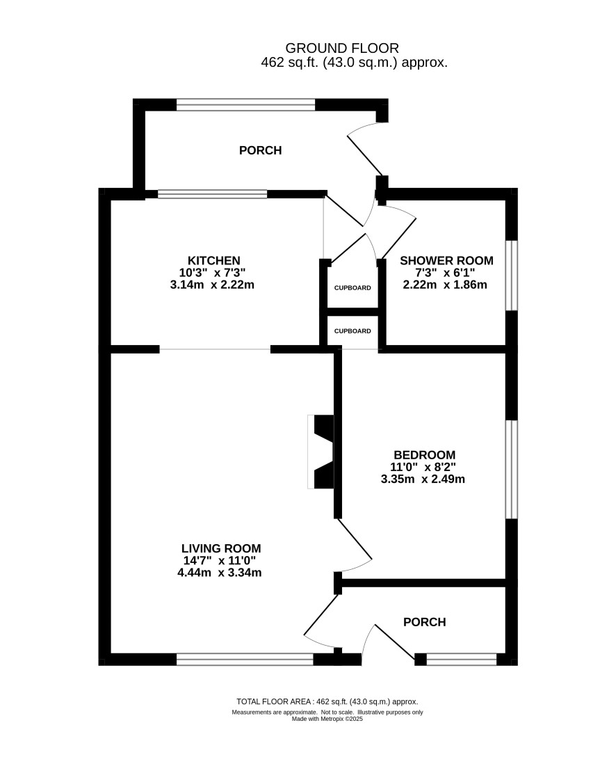 Front porch, living room, kitchen, bedroom, shower room, rear porch