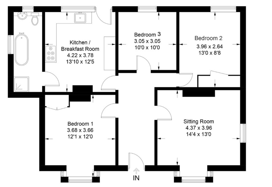 The bedrooms are accessed via the entrance hall. Bedroom One is a generously sized double room featuring a bay window to the front, built-in shelving, and an additional built-in cupboard with slatted shelving. Bedroom Two is also a double room, offering a rear-facing window and a built-in double wardrobe with a hanging rail and overhead shelf. Bedroom Three is another well-proportioned room with a window overlooking the rear.