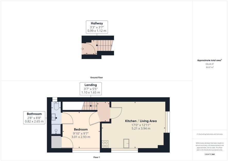 Ground floor: entrance hall First floor: kitchen / living area, bedroom with ensuite shower