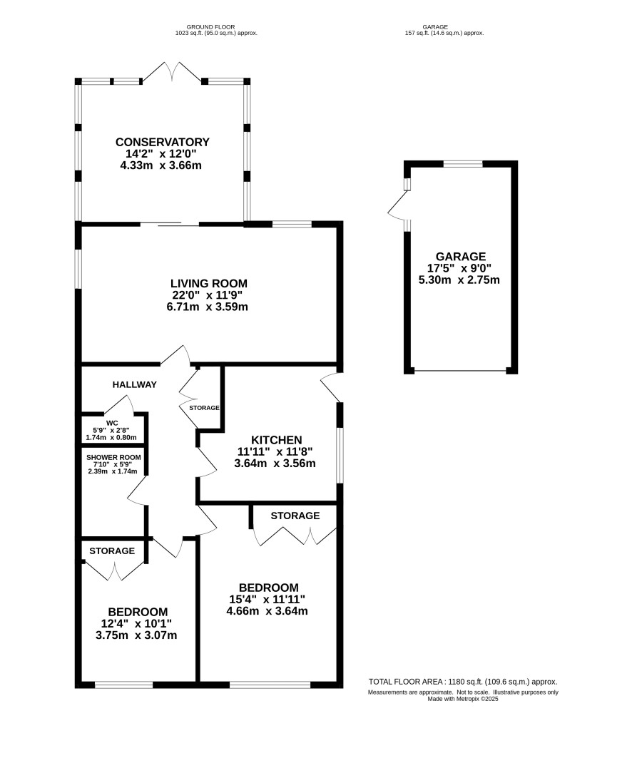 Kitchen, two bedrooms, shower room, wc, hallway, living room, conservatory