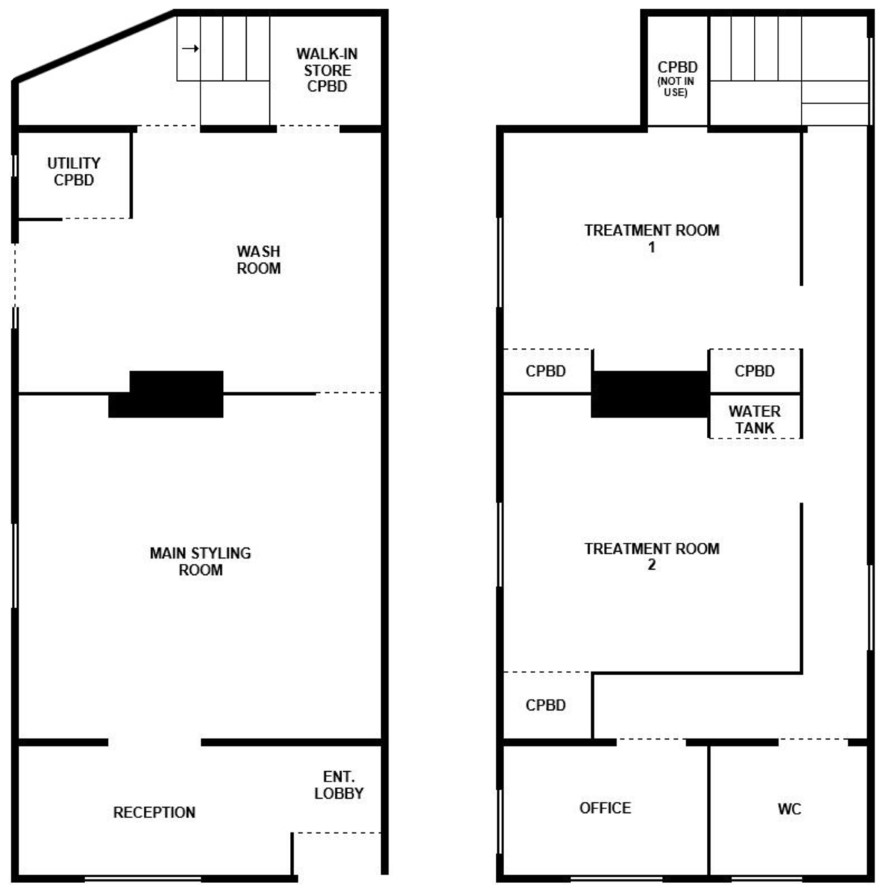 Reception area, main salon, wash room, utility area rear hall and stairs.