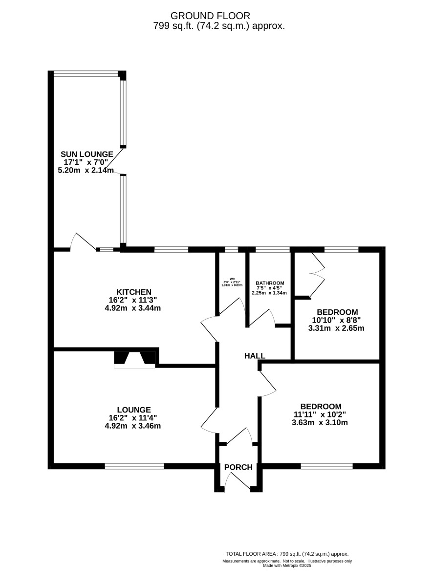 Entrance porch, hall, lounge, two bedrooms, kitchen, sun lounge, bathroom, separate wc.