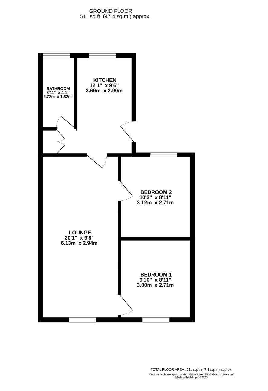 Lounge, kitchen, two bedrooms and a bathroom.
