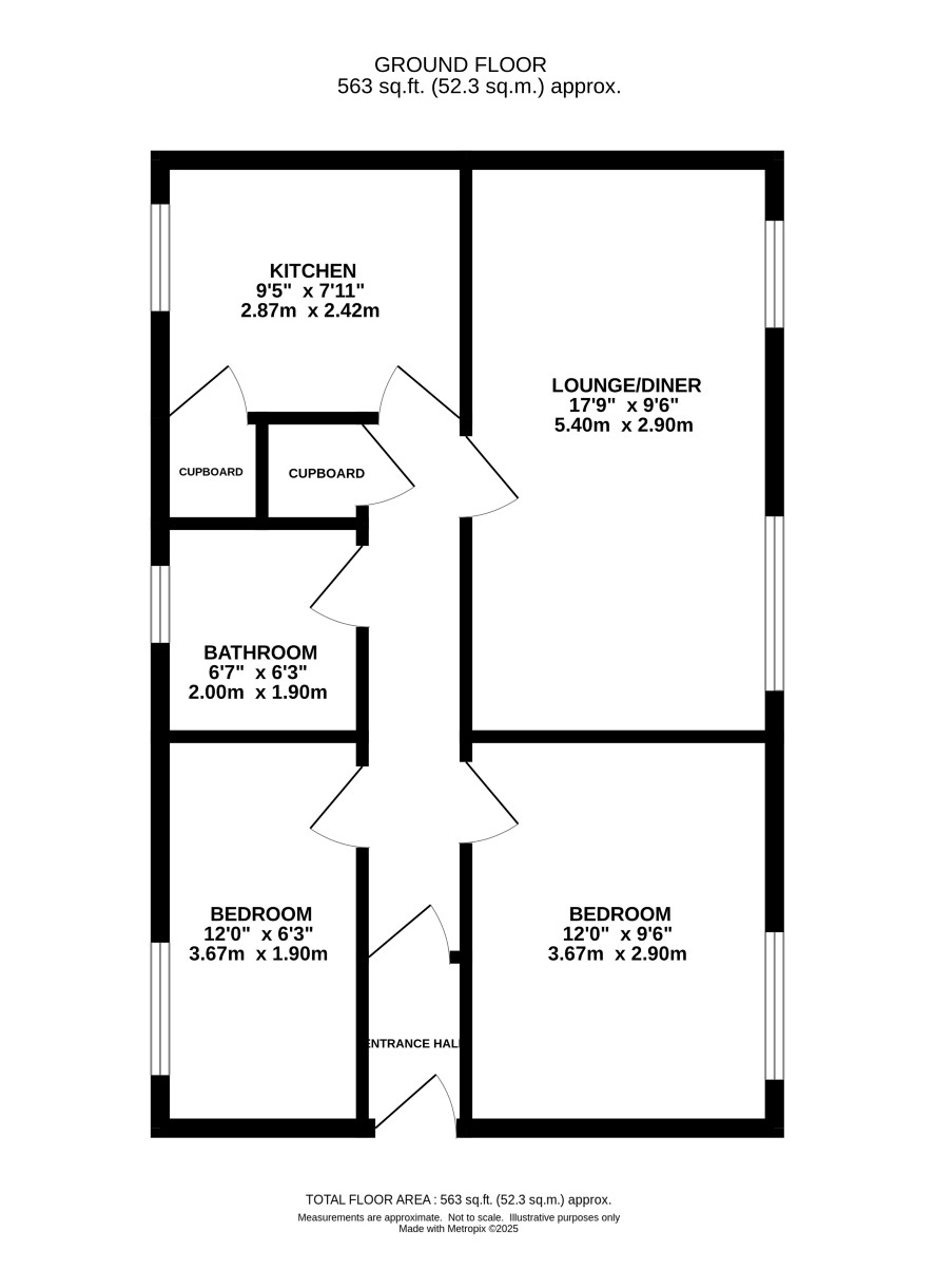 Access to first floor, entrance hall, two bedrooms, bathroom, kitchen, lounge/diner