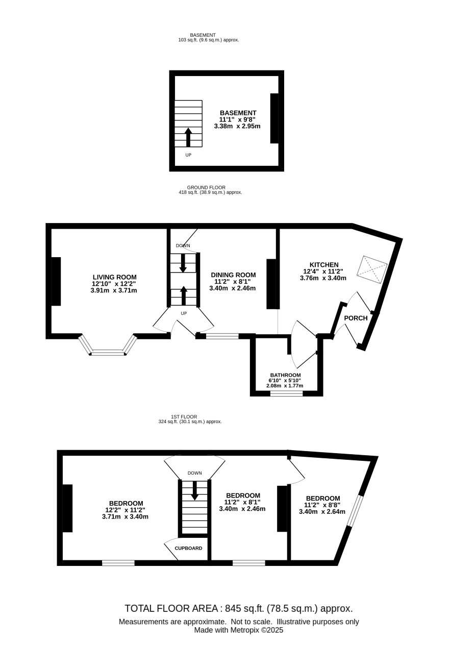 Lower ground floor: basement room First floor: entrance, lounge, dining room, kitchen, bathroom, porch Second floor: three bedrooms