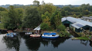 Mooring plot on Thorpe Island in picturesque spot with stunning views over the River Yare in Norwich. With houseboat, bungalow, decked 10 metre quay head mooring, slipway, shepherd's hut and further outbuildings.