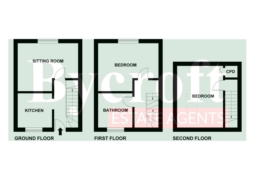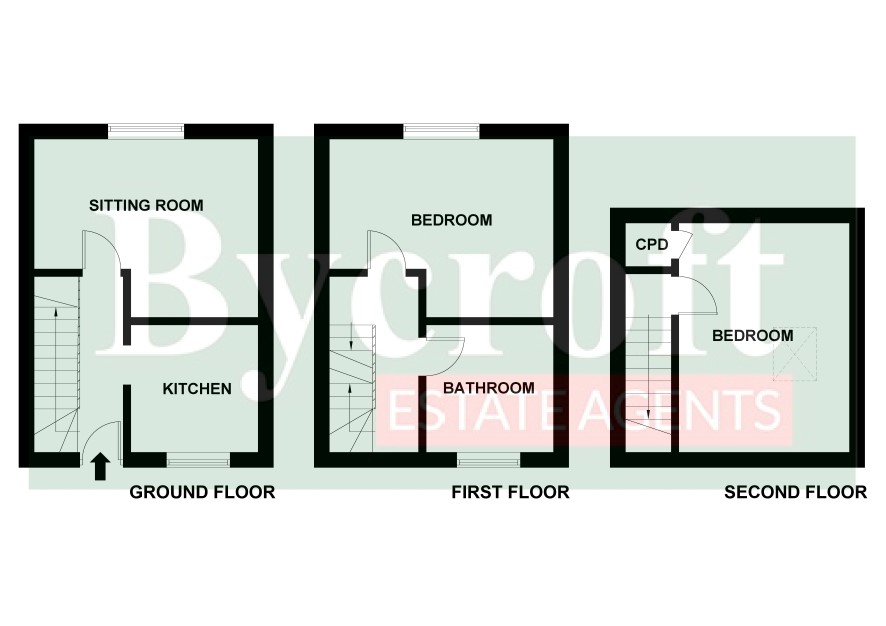 Ground floor: entrance hall, kitchen, sitting room First floor: Landing, bathroom, bedroom Second floor: bedroom Outside: courtyard garden area with shingled residence parking area.