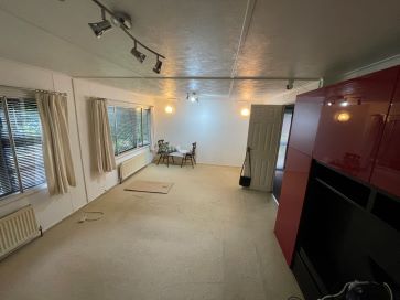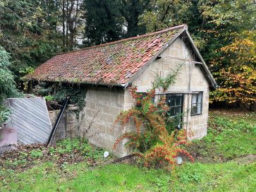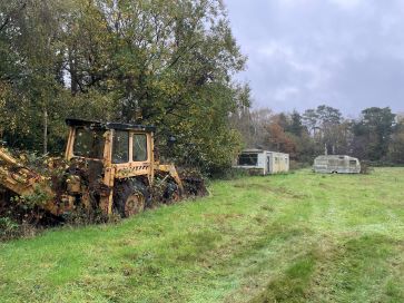 Outbuilding, timber shed, metal green shed, dilapidated caravan