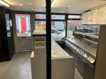 Chip shop, store room, kitchen and hall to side access.