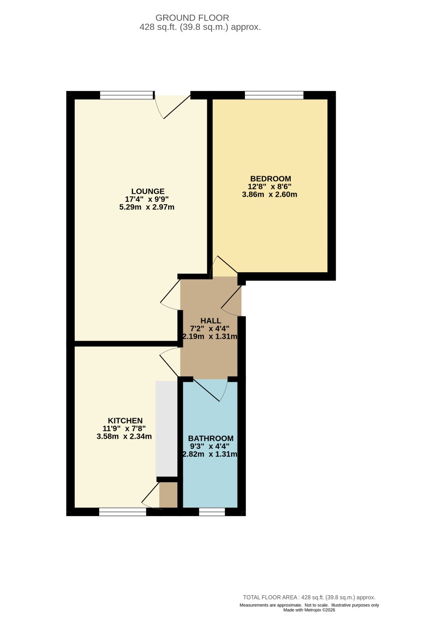 Bright airy Communal entrance and hallway. Personal Entrance Door to Entrance Hall: 7'2" x 4'4" Lounge: 17'4" x 9'9" Kitchen: 11'9" x 7'8" Bedroom: 12'8"x 8'6" Bathroom/WC: 9'3" x 4'4" Direct access from Lounge to
