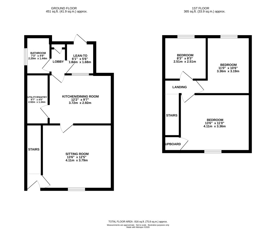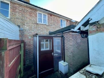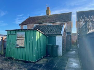 Small lawned front garden, enclosed rear garden with storage shed.