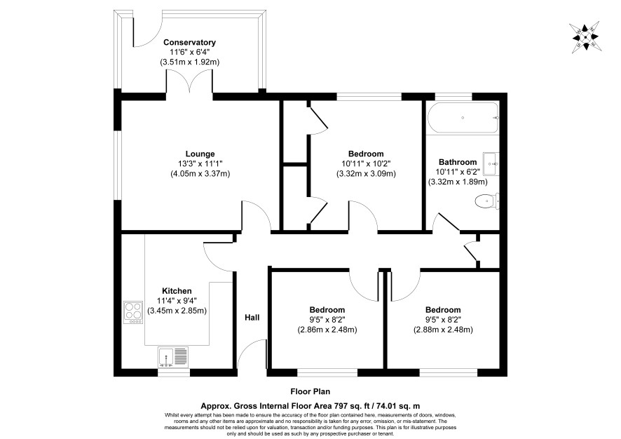 Entrance hall, sitting room, conservatory, kitchen, three double bedrooms and wet room.