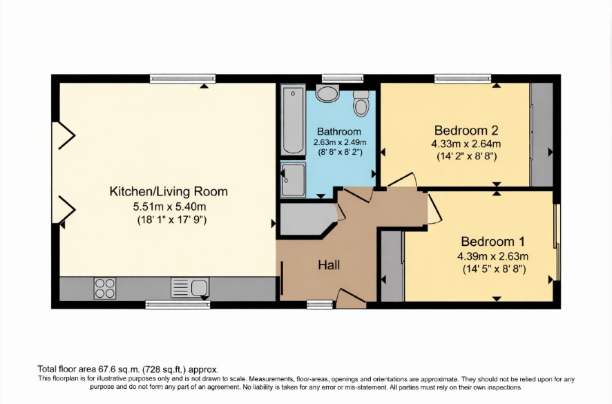 Hall, lounge/kitchen, two bedrooms and a bathroom.