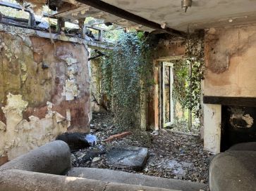 A derelict fire damage four bedroomed bungalow set in approaching an acre within a very rural location