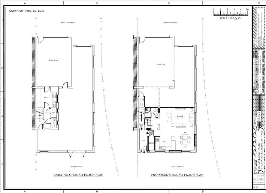 EXISTING Shop: 540 Sq Ft F F Flat: 520 sq Ft Part Completed G F Extension: 646 Sq ft PROPOSED Ground Floor: 1238 Sq Ft First Floor: 1083 Sq Ft Total: 2421 Sq Ft
