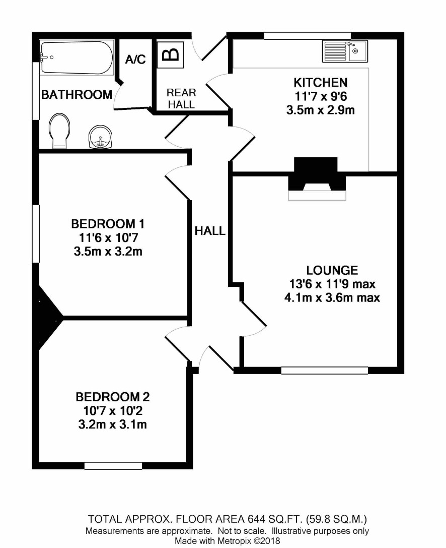 Hall lounge, kitchen, two bedrooms, bathroom
