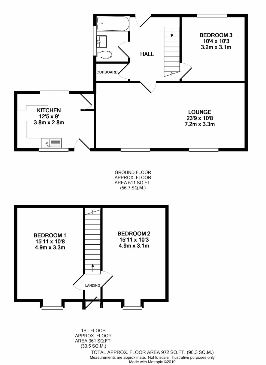 Hall, lounge, kitchen, bedroom 3, bathroom