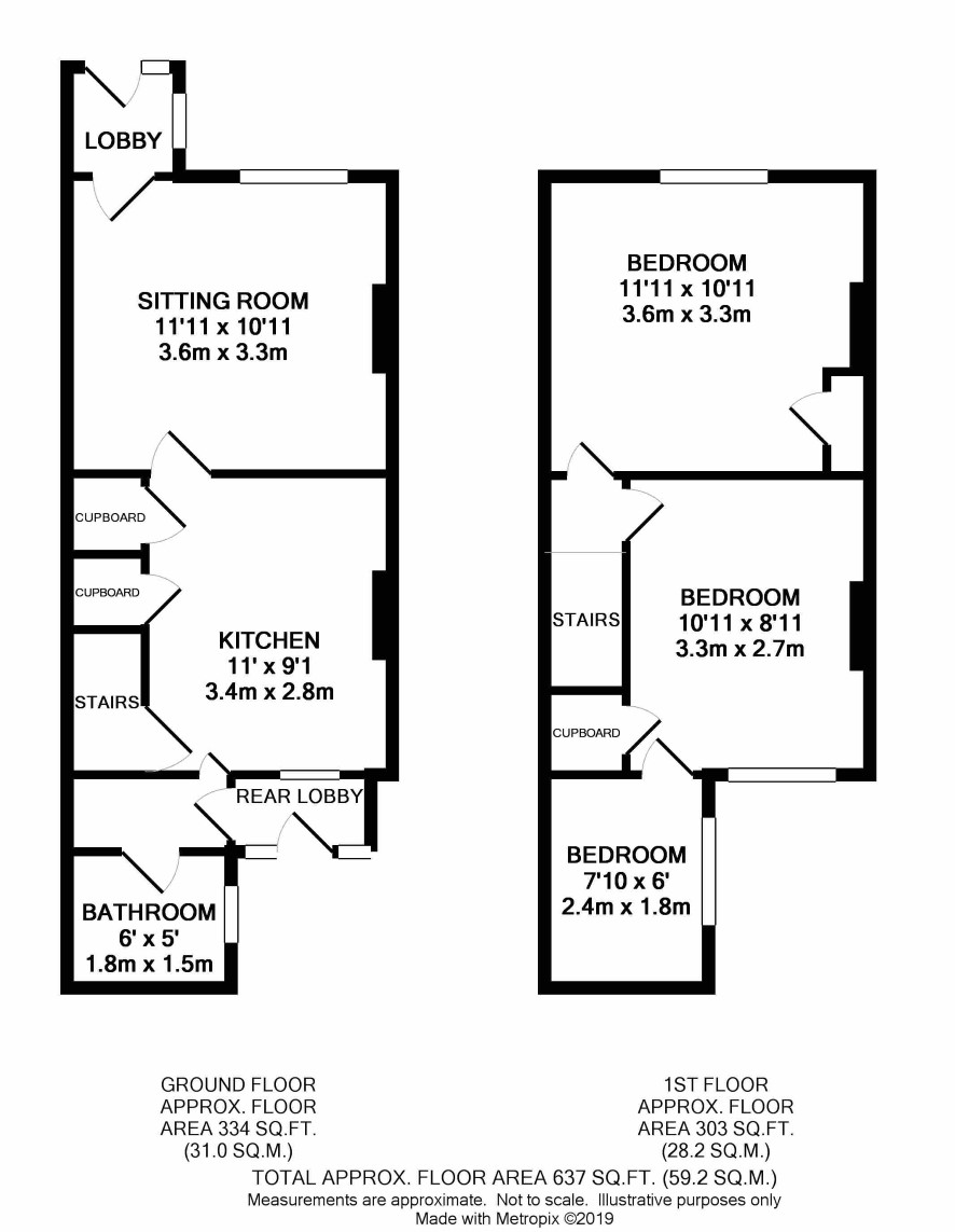 Small front garden. Rear garden.with outbuilding.