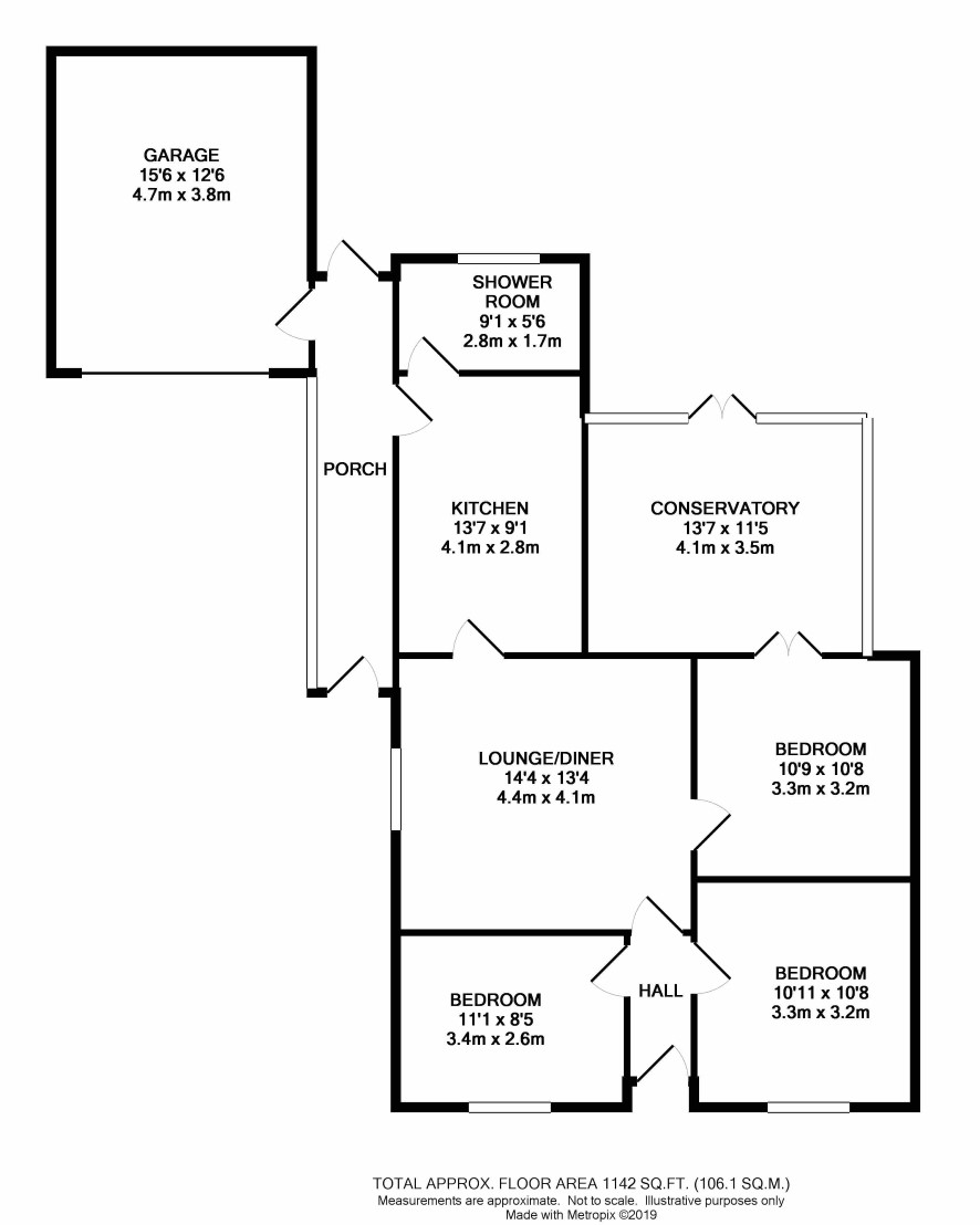 Entrance hall, living room, kitchen, dining room/bedroom 3, two further bedrooms, conservatory, shower room