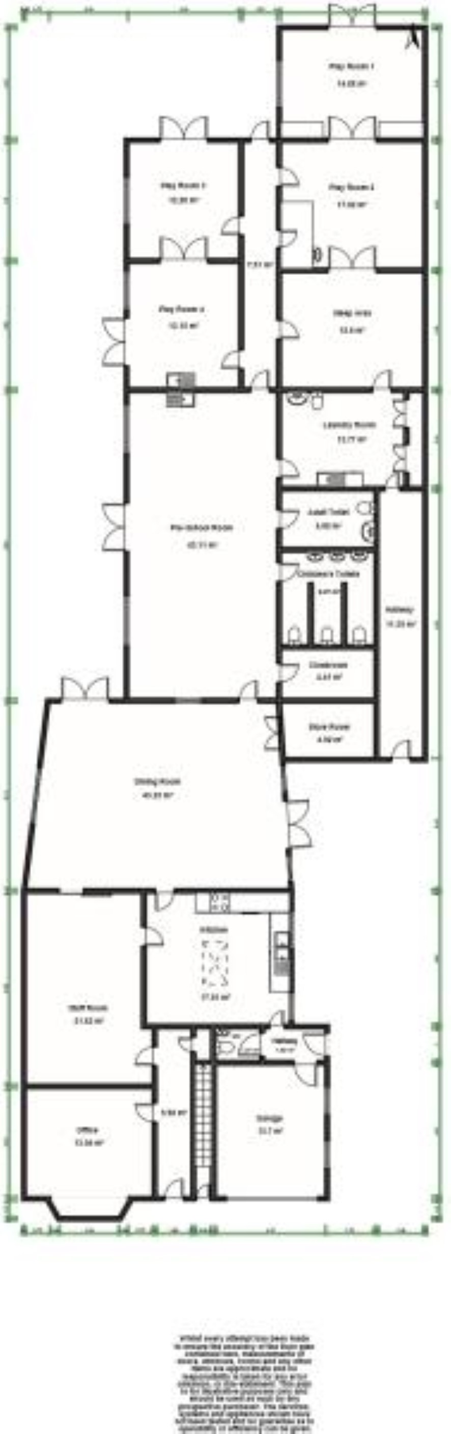 Entrance hall, office, staff room, kitchen, w.c., toddler room, walk in cupboard, pre-school room, cloak room, w.c. x 2, utility / nappy changing room, rear entrance hall