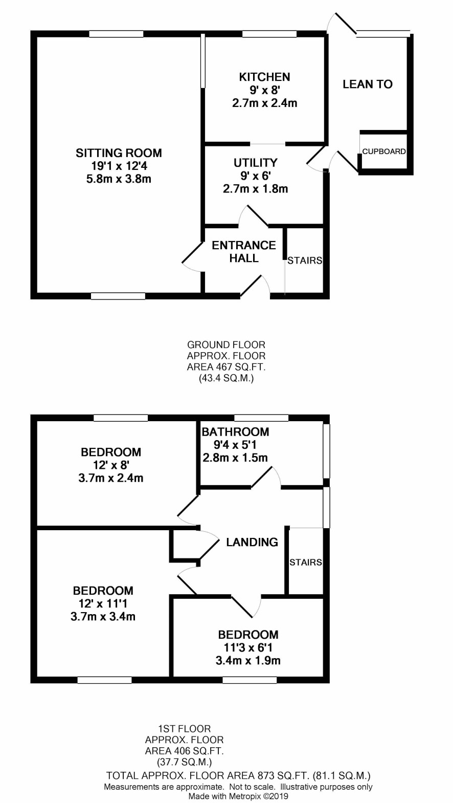 Ground floor: entrance hall, sitting room, utility, kitchen, lean to extension First floor: landing, three bedrooms, bathroom Outside: front garden, enclosed rear garden with two wooden sheds, off road parking space to the front