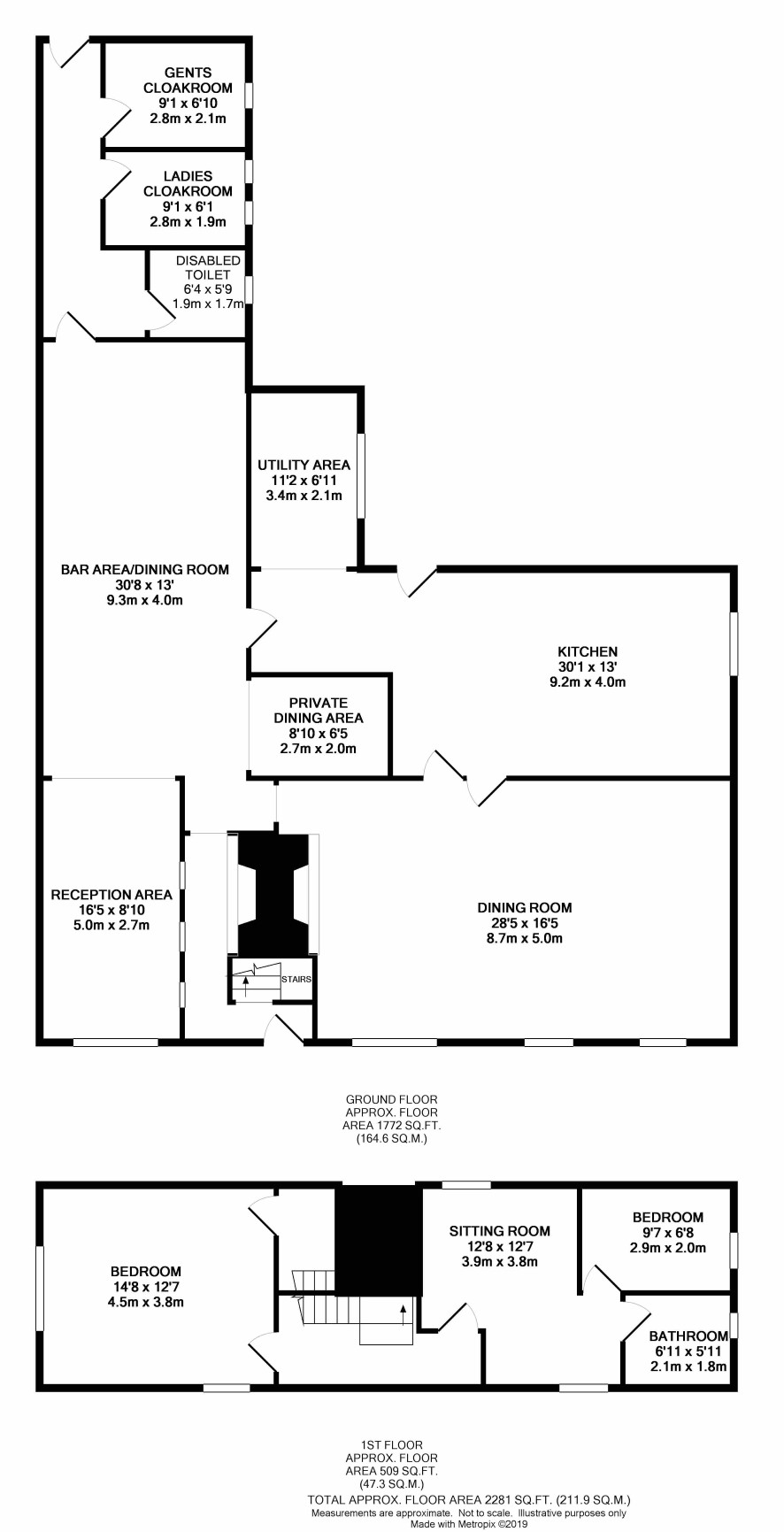 Entrance lobby, reception and private dining room, bar area, main dining room, commercial kitchen, utility area, WC's
