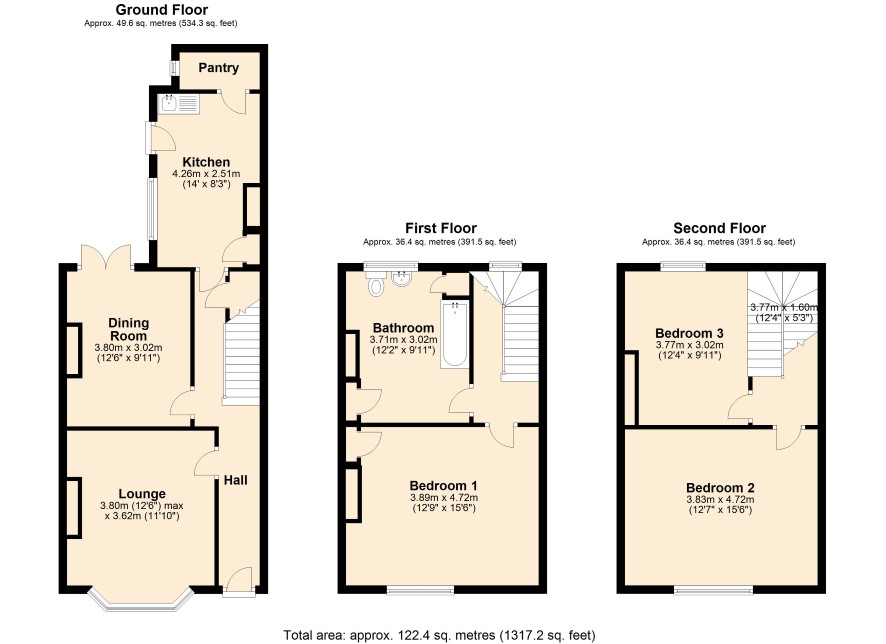 Ground Floor: Entrance Hall, Reception One, Reception Two, Kitchen. First Floor: Landing, Bedroom One, Bathroom. Second Floor: Bedroom Two, Bedroom Three. Outside: To the rear there is a paved garden with brick stores and an access gate.