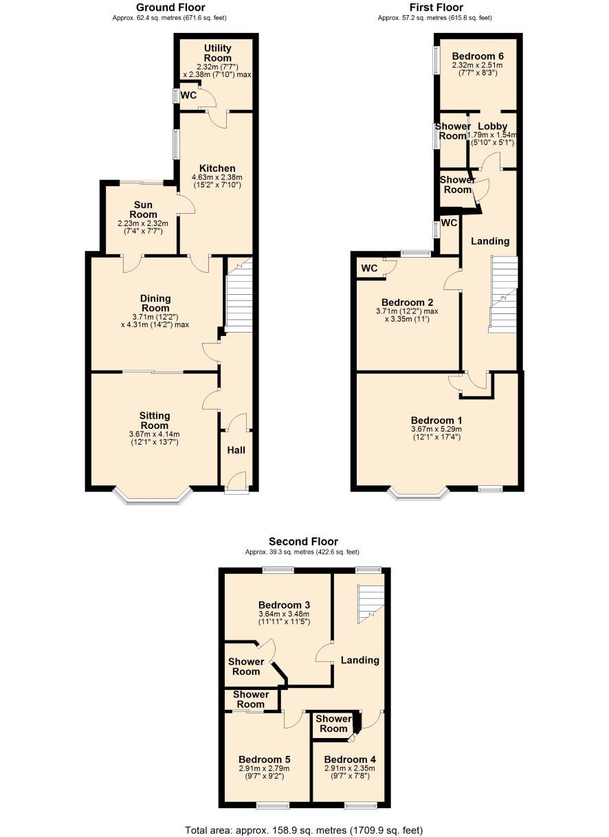 Ground Floor: Sitting Room, Dining Room, Kitchen, Utility Room, Sun Room, WC. First Floor: Landing, Bedroom One, Bedroom two, Separate WC, Shower Room, Bedroom Six, En-suite Shower Room. Second Floor: Bedroom Three, En-suite Shower Room, Bedroom Four, En-suite Shower Room, Bedroom Five, En-suite Shower Room. Outside: To the front of the property is a forecourt area whilst to the rear is an enclosed courtyard.