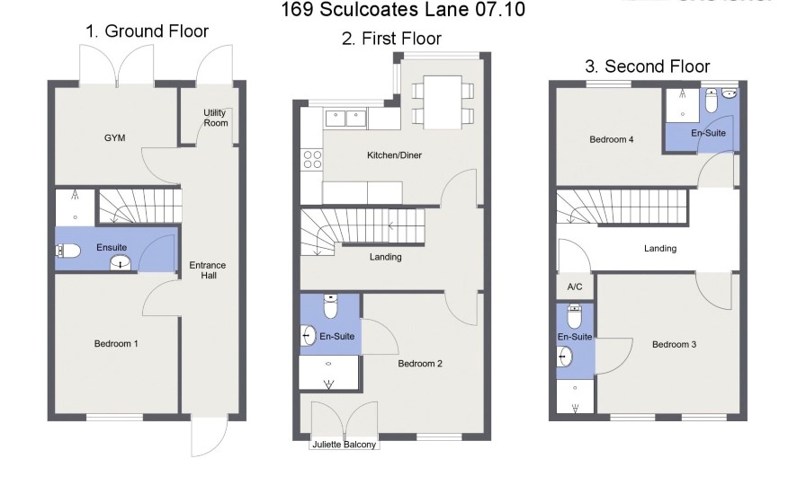 Ground Floor: Entrance Hall, Living Room, Bedroom 1 & En Suite Shower/WC, Utility First Floor: Landing, Kitchen/Dining Room, Bedroom 2 & En Suite Shower/WC. Second Floor: Landing, Bedrooms 3 & 4 with En Suite Showers/WC. Outside: Forecourt, rear garden. Parking space.