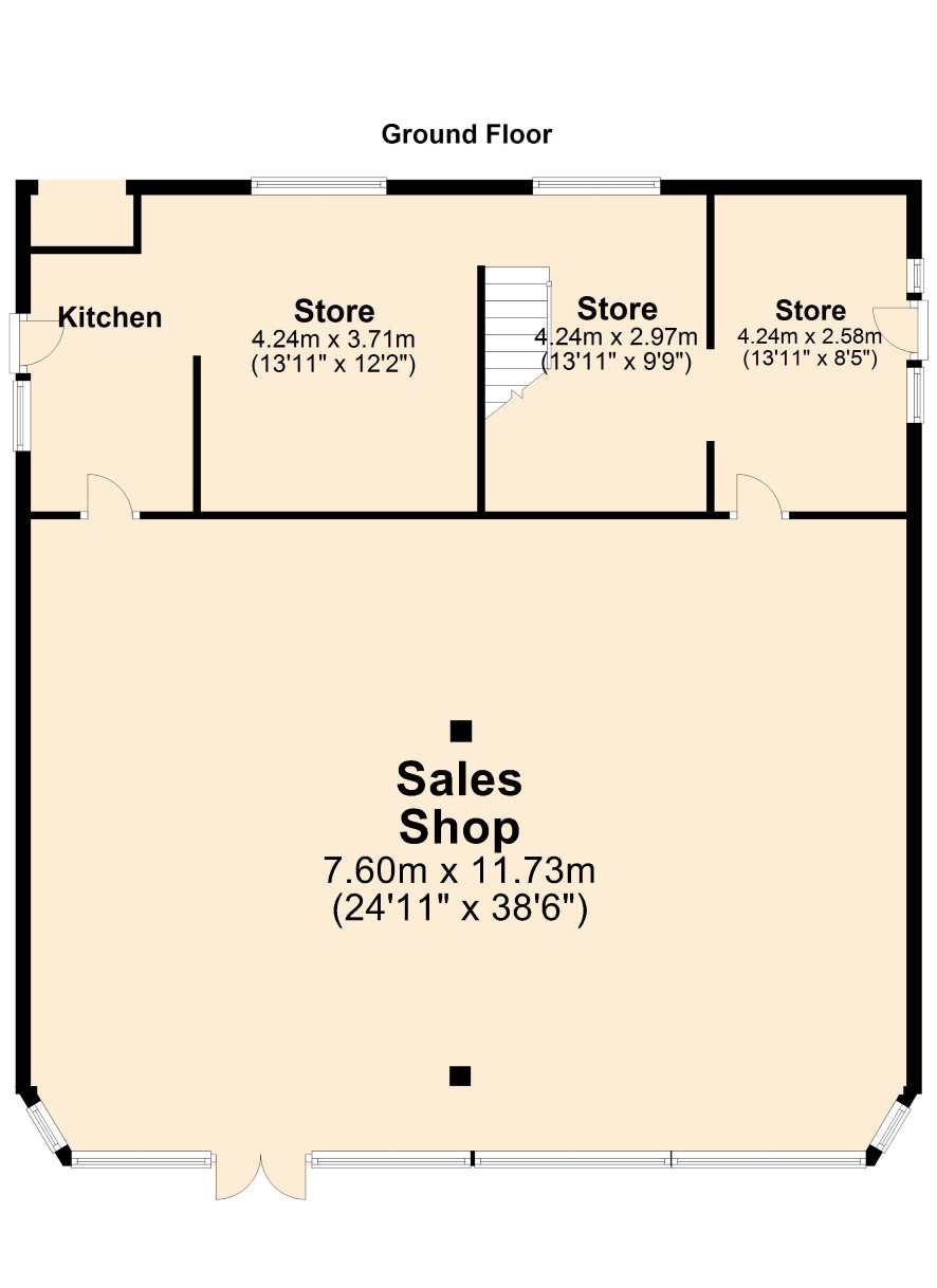 Ground Floor Sales: Approx.1,085 sq ft (100 sq m). Stores etc: 460 sq ft (42.7 sq m). First Floor Stores/Staff Area: 1,000 sq ft (92.9 sq m) includes two WCs.