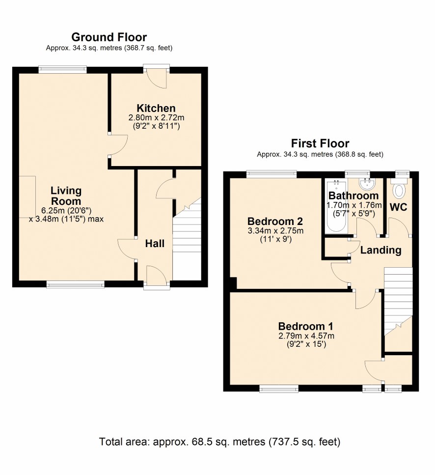 Ground Floor: Hall, Living Room, Kitchen. First Floor: Landing, Bedroom One, Bedroom Two, WC, Bathroom. Outside: Front and rear garden.
