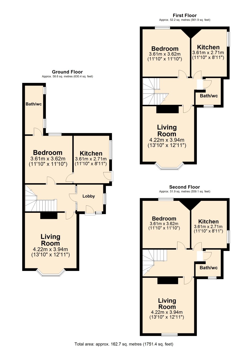 Ground Floor: Entrance Vestibule, Entrance Hall, Living room, Bedroom, En-Suite Bathroom, Kitchen. First Floor: Landing, Living Room, Bathroom/WC, Kitchen, Bedroom. Second Floor: Landing, Living Room, Bathroom/WC, Bedroom, Kitchen.