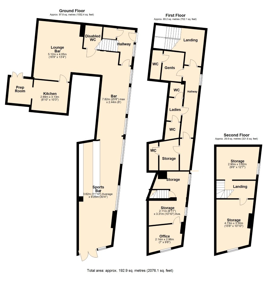 Ground Floor: Sports Bar, Side Bar, Disabled WC, Lounge Bar, Kitchen, Prep Room, Hallway. First Floor: Landing, Office, Storage, Storage, Storage, Hallway, Ladies, Gents. Second Floor: Landing, Storage, Storage. Outside: To the rear is a small yard and service area with access from Cross Hill car park.