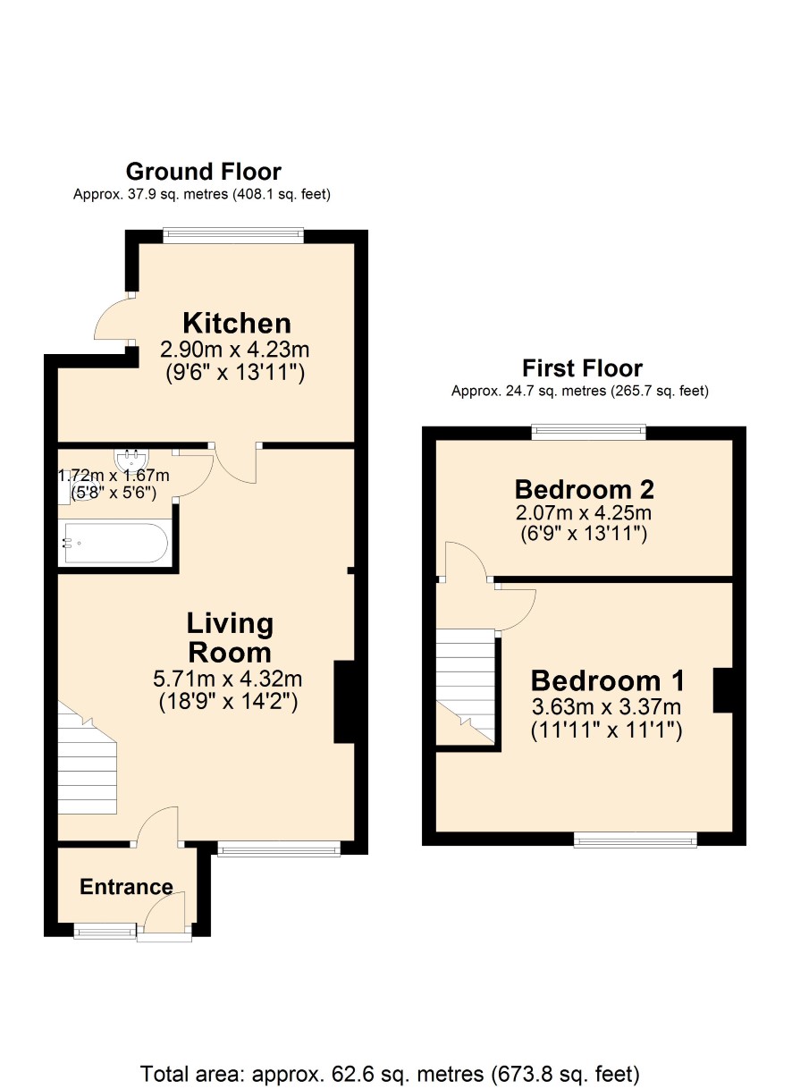 Ground Floor: Entrance Porch, Living Room, Bathroom/WC, Kitchen. First Floor: Landing, Bedroom One, Bedroom Two. Outside: Front garden covered with stone chippings. Rear garden with paving stone chippings and large concrete sectional shed plus handgate on to rear tenfoot.
