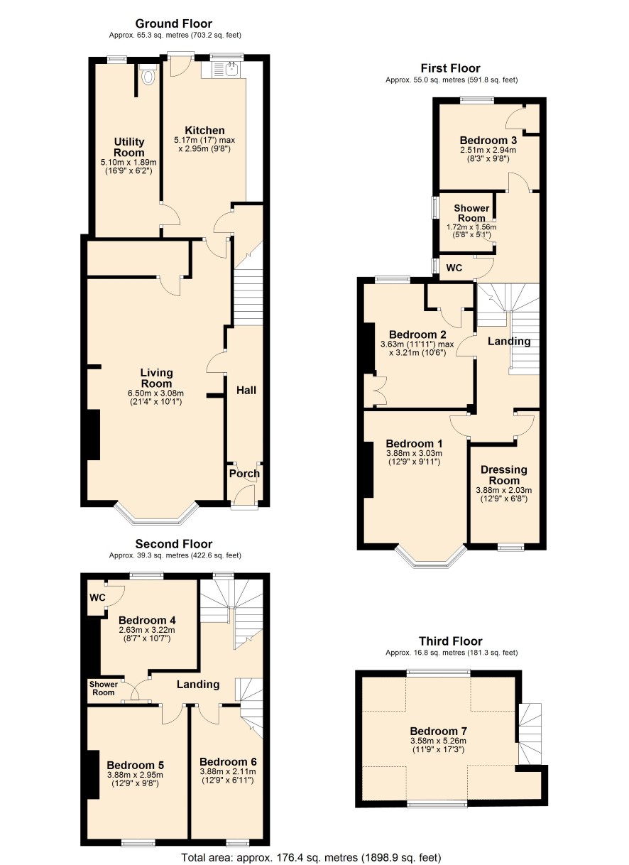Ground Floor : Porch, Hall, Living Room, Kitchen, Utility Room First Floor: Landing, Bedroom 1, Dressing Room, Bedroom 2, Bedroom 3, WC Second Floor : Bedroom 4, Bedroom 5, Bedroom 6, WC, Shower Room Third Floor : Bedroom 7
