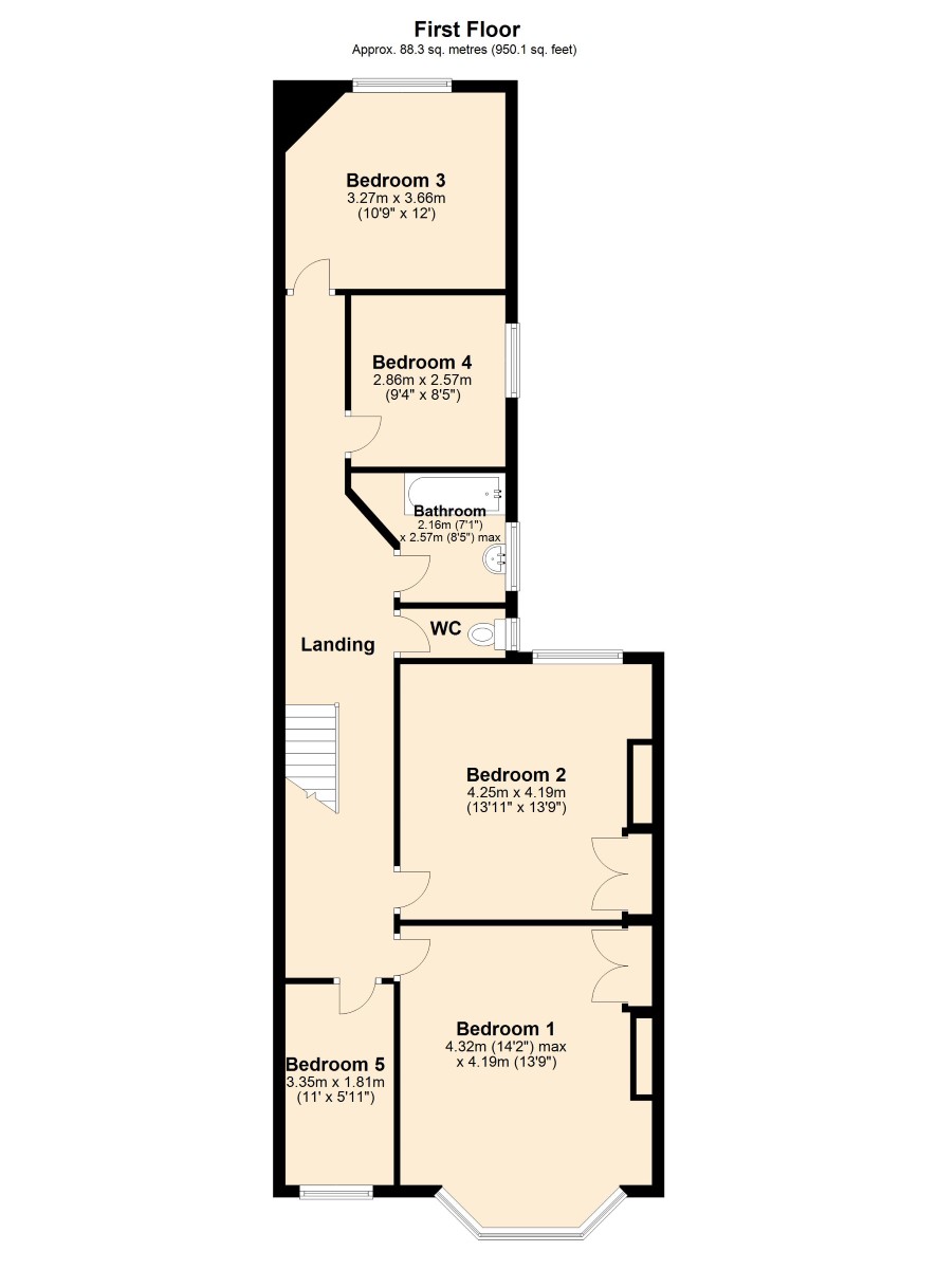 Ground Floor: Reception room one, reception room two, day room, kitchen First Floor: bedroom one, bedroom two, bedroom three, bedroom four, bedroom five, bathroom, WC Outside: There is a small front garden and a rear garden with gate giving access to tenfoot. Garage.