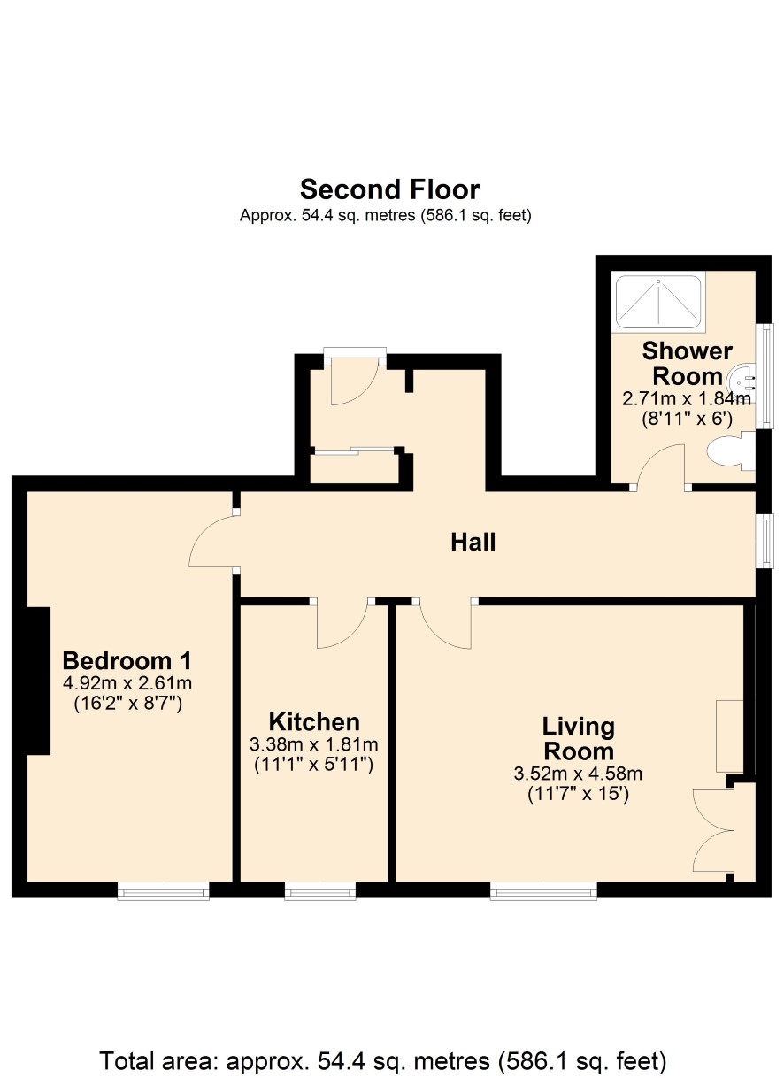 Ground Floor : Communal entrance Second Floor : Hall, Living Room, Kitchen, Shower Room, Bedroom.