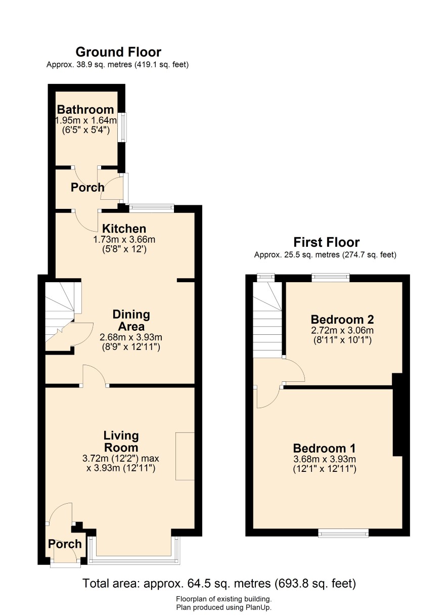 Ground Floor: Porch, Living Room, dining area, kitchen, rear hall, bathroom. First Floor: two double bedrooms. Outside: small forecourt garden and rear yard with pedestrian access.