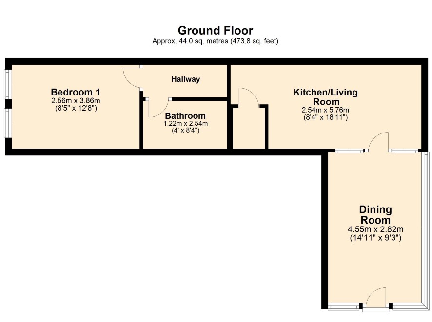 Dining room Kitchen & Living Area Bedroom Bathroom Outside To the front, there are 4 car parking spaces serving the building. To the rear is a paved, communal courtyard.