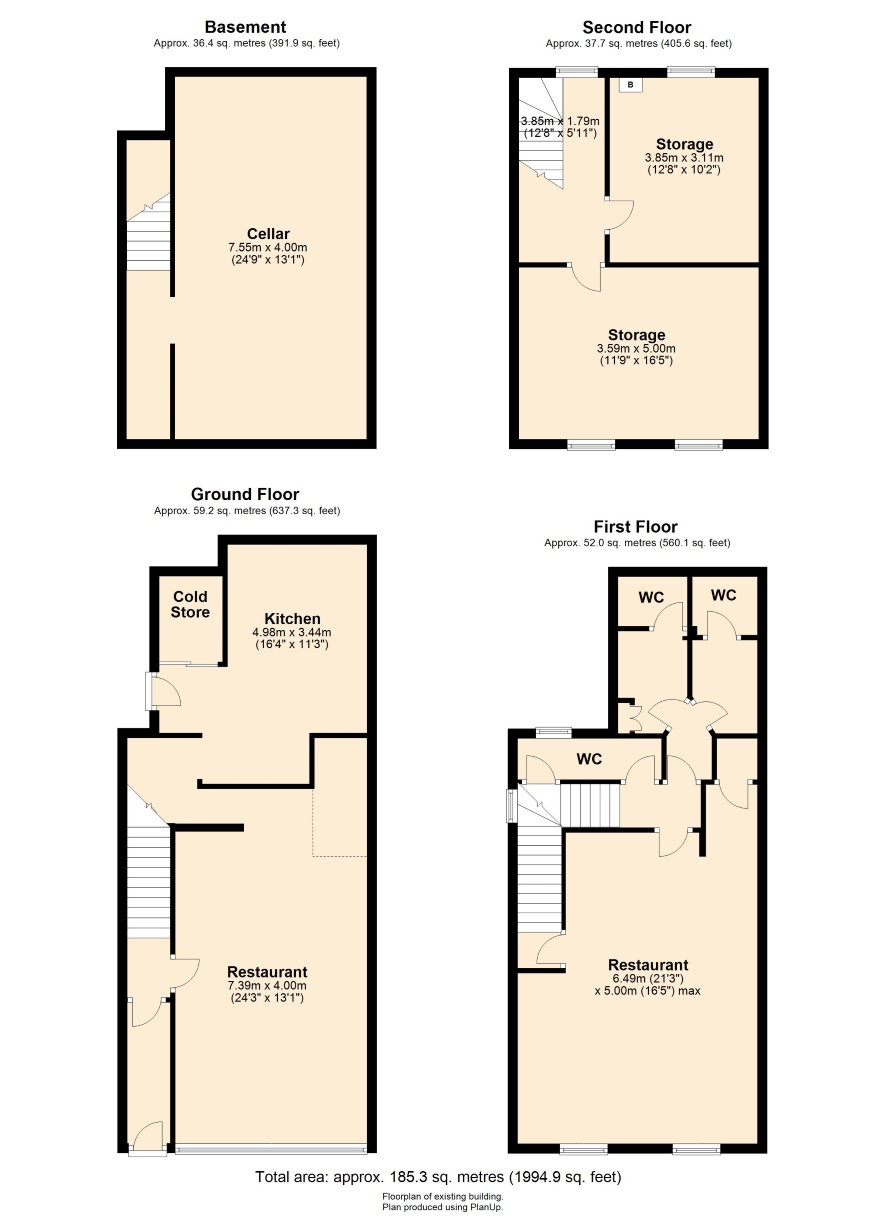 Ground Floor: Entrance leading to the ground floor restaurant with 24 covers, bar area with good sized commercial kitchen off including six burner gas oven with professional extraction, tandoori oven, fryers etc. Storage area with walk-in cold room. First Floor: Restaurant area with 36 covers. further bar area, ladies and gents toilets, staff toilet. Second Floor: Two large storage rooms. Cellar: With restricted head clearance (approx 5'8") the cellar provides excellent extra storage space. Outside: Yard with refuse area.