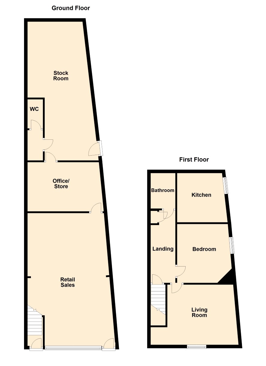Ground floor: Retail sales area, Storage room, Stock room, WC First Floor: Private entrance, landing, Living room with log burner, Kitchen, bathroom, Bedroom.