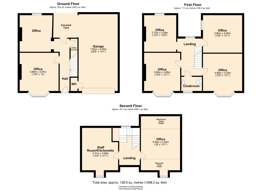 Ground floor: The property offers an entrance hall, a large front office/reception room, and a further office to the rear of the building. The remaining ground floor area provides a secure garage for car parking and storage, fitted with an electric sectional roller shutter door. First floor: Four individual offices, each of different sizes. Those to the front benefit from bay windows and good natural light. There is also a staff cloakroom. Second floor: Two further offices, one of which has been historically used as a staff room and kitchenette. Cellar: Approached from the entrance hall the cellar provides an additional 153 Sq Ft of storage space.