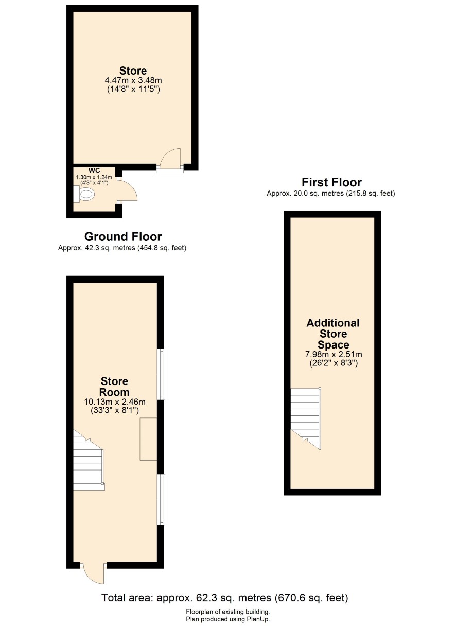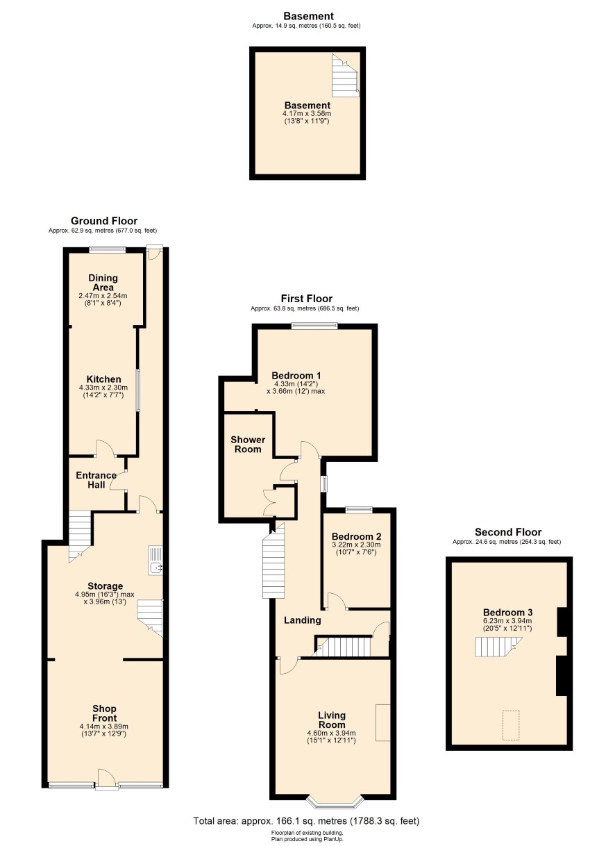 The accommodation extends in total to around 1,265 sq ft (117 sq m) or thereabouts and comprises: Ground Floor Retail Area (3.97m x 9.38m) with stairs leading to: Basement (4.17m x 3.58m). Shared rear passageway leading to a Former Showroom providing ground-floor accommodation (10.13m x 2.46m) and first-floor accommodation (7.98m x 2.51m). Further Former Showroom (3.48m x 4.47m) Outside WC Apartment Ground Floor: Entrance Hall Kitchen With Dining Area, stainless steel sink, base, and wall units, plumbing for an automatic washing machine, electric cooker point, radiator. First Floor: Landing With a double radiator and enclosed staircase to the second floor. Living Room With fireplace housing an electric fire, TV aerial point, and double radiator. Bedroom One With radiator, TV aerial point, and large storage cupboard/wardrobe. Bedroom Two With radiator. Shower room With Shower cubicle, low-level WC, wash hand basin, radiator and large linen cupboard. Second Floor: Bedroom Three With a double radiator and Velux window.